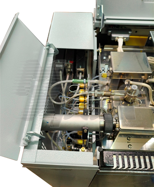 Входное давление газов стабилизируется с помощью электронных регуляторов давления. Возможно использование двух газов-носителей, а также их переключение.