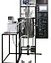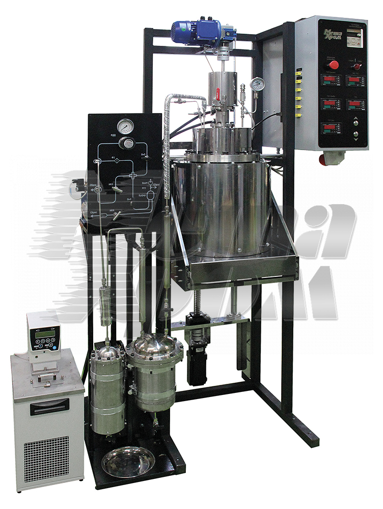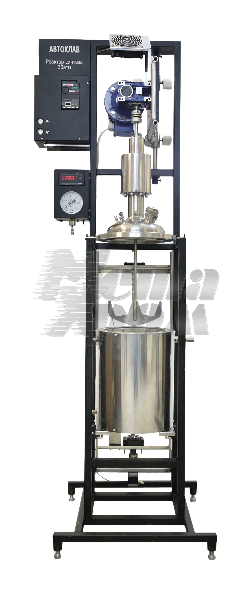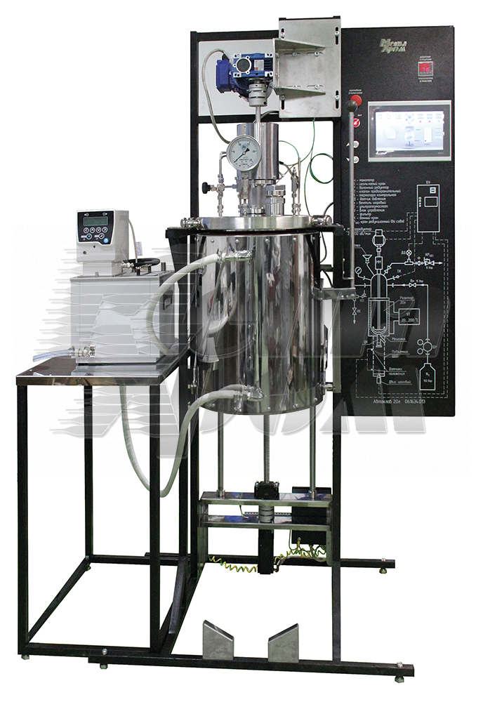 Колба герметично закрывается сферической крышкой, на которой размещены магнитная муфта привода мешалки, шлюз для загрузки сыпучего, жидкого продукта, предохранительный клапан, датчик давления, вентиль для сброса давления, разборный пробоотборник жидкой фазы и термопара для измерения температуры в реакторе автоклава. Колба с крышкой закреплены на станине, включающей в себя кронштейн крепления привода мешалки, электрический подъемник для облегчения монтажа и демонтажа колбы автоклава и панель с элементами индикации параметров работы автоклава.