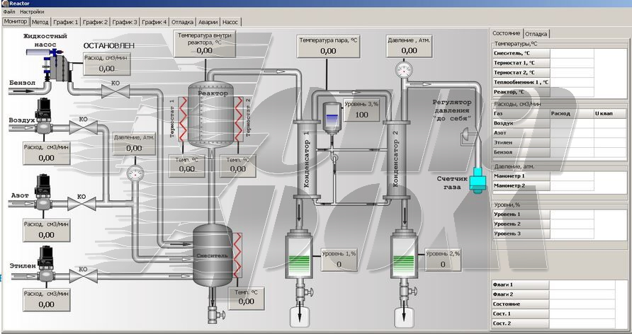- С температурным датчиком в реакторе, расположение которого определяет оператор. Оператор также может по своему усмотрению менять расположение датчика, в том числе и в процессе проведения эксперимента (постоянное значение времени температурного датчика составляет 1–2 секунды).
