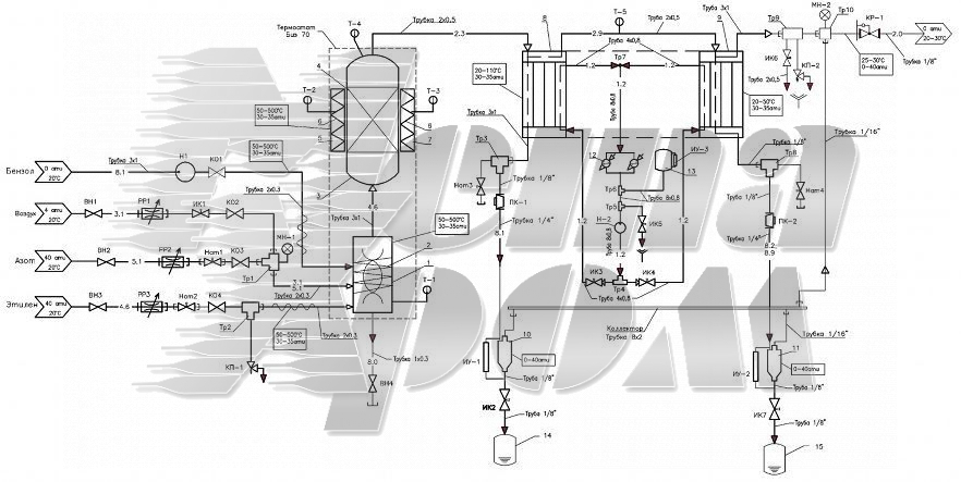 - Система автоматического контроля и защиты от превышения давления в установке. В устройство системы входят электронные преобразователи давления, которые установлены перед реактором и после него, а также предохранительные защитные клапаны механического типа. Клапаны настраиваются на 0,5 МПа выше, нежели рабочее давление в самой системе. Если срабатывают предохранительные клапаны, то парогазовые смеси сбрасываются в дренажную систему, выходное отверстие которой соединено, либо с емкостью для утилизации, либо с атмосферой. Все данные с электронных преобразователей передаются в ПК и идентифицируются на экране. Если заданные пороги превышены, то жидкости и газы автоматически прекращают попадать в установку, формирование их потоков осуществляется регуляторами расхода газа и насосами.