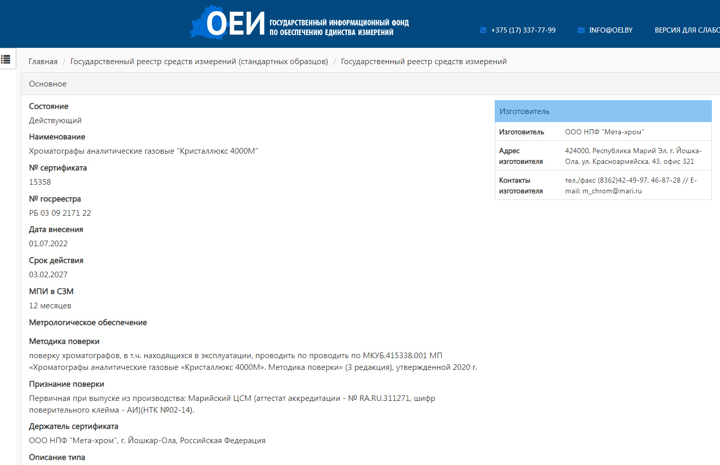 Газовый хроматограф «Кристаллюкс-4000М» включен в государственный реестр средств измерений (стандартных образцов) Республики Беларусь.