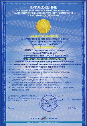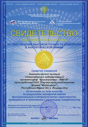 Хроматограф «Кристаллюкс-4000М» награжден знаком качества «За обеспечение высокой точности в аналитической химии» в номинации «Контрольно измерительные приборы», который согласно Положению может быть размещаться на изделии в течение двух лет. Знак качества присвоен по итогам конкурса «ФГУ «Ростест-Москва» на основании заключения экспертной комиссии.