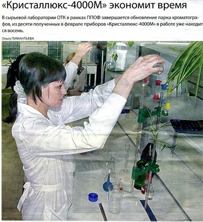 В газете «Сибур Тольятти» опубликована статья об обновлении парка хроматографического оборудования на предприятии «Тольяттикаучук», в которой работники предприятия делятся впечатлениями о работе газового хроматографа «Кристаллюкс-4000М»:
