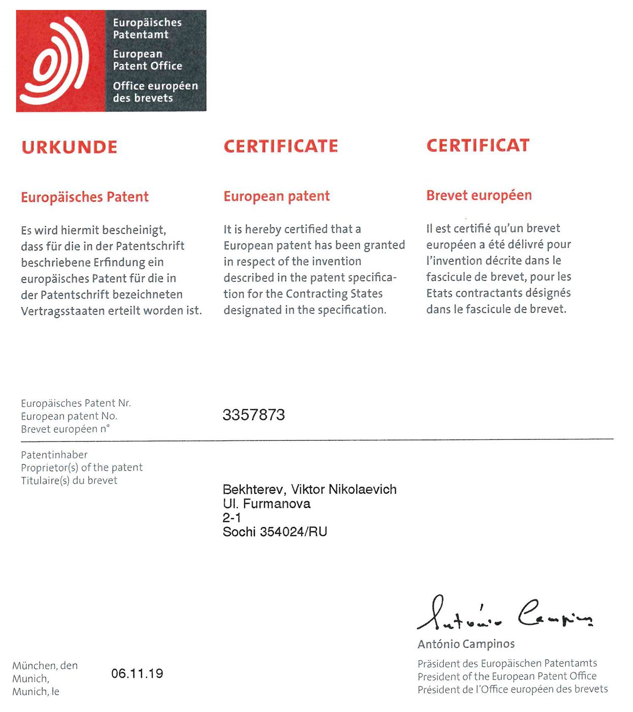 Европейский Патент EPO3357873/2019, Патенты РФ RU2303476/2007, RU2564999/2015, Патент Кыргызской Республики KG388/2020, Международная заявка PCT/RU2015/000615.