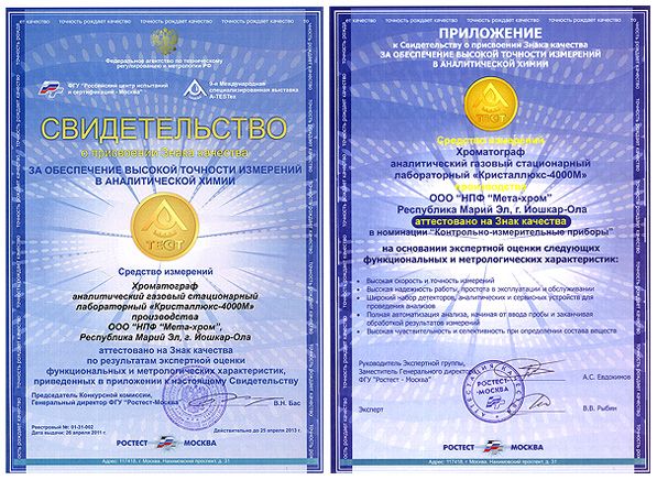 Как всегда, НПФ «Мета-хром» принимала участие в ежегодной выставке «A-TESTex-2011» («Analytica Expo-2011»). На стенде наши специалисты демонстрировали выпускаемую продукцию, в т.ч. последние разработки. Среди экспонатов - газовый хроматограф «Кристалюкс-4000М», промышленный газовый хроматограф для коммерческого учета газа «Петрохром-4000», измерительно-вычислительный комплекс «Вулкан-2022М», «Гейзер», «Лабораторная реакторная установка для проверки катализаторов» (УИК-1) и др. По итогам выставки хроматографы «Кристалюкс-4000М» и «Петрохром-4000» награждены Знаком качества в номинации «Контрольно-измерительные приборы» по результатам экспертной оценки ФГУ «Ростест-Москва».